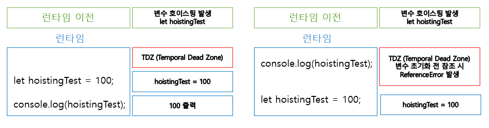 런타임 이전 변수 호이스팅이 발생하고 변수가 초기화 되기 전 구간을 TDZ (Temporal Dead Zone) 이라고 하며 이 구간 내에서 참조가 발생 시 참조 오류가 발생한다.