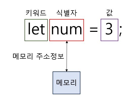 식별자에는 메모리 주소정보가 들어가며 값은 메모리 주소에 저장되는 개념이다.