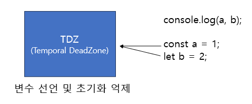 이를 개선하기 위해서 TDZ(Temporal DeadZone)이라는 가상의 공간을 만들어 호이스팅 시 변수 선언 및 초기화가 되지 않도록 억제한다.
